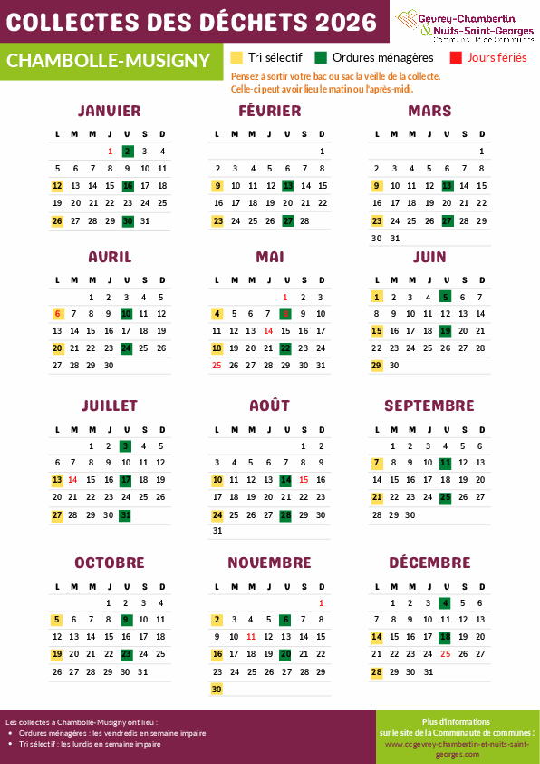 La Communauté de Communes Gevrey-Nuits vous informe que la collecte des déchets est organisée de la façon suivante :